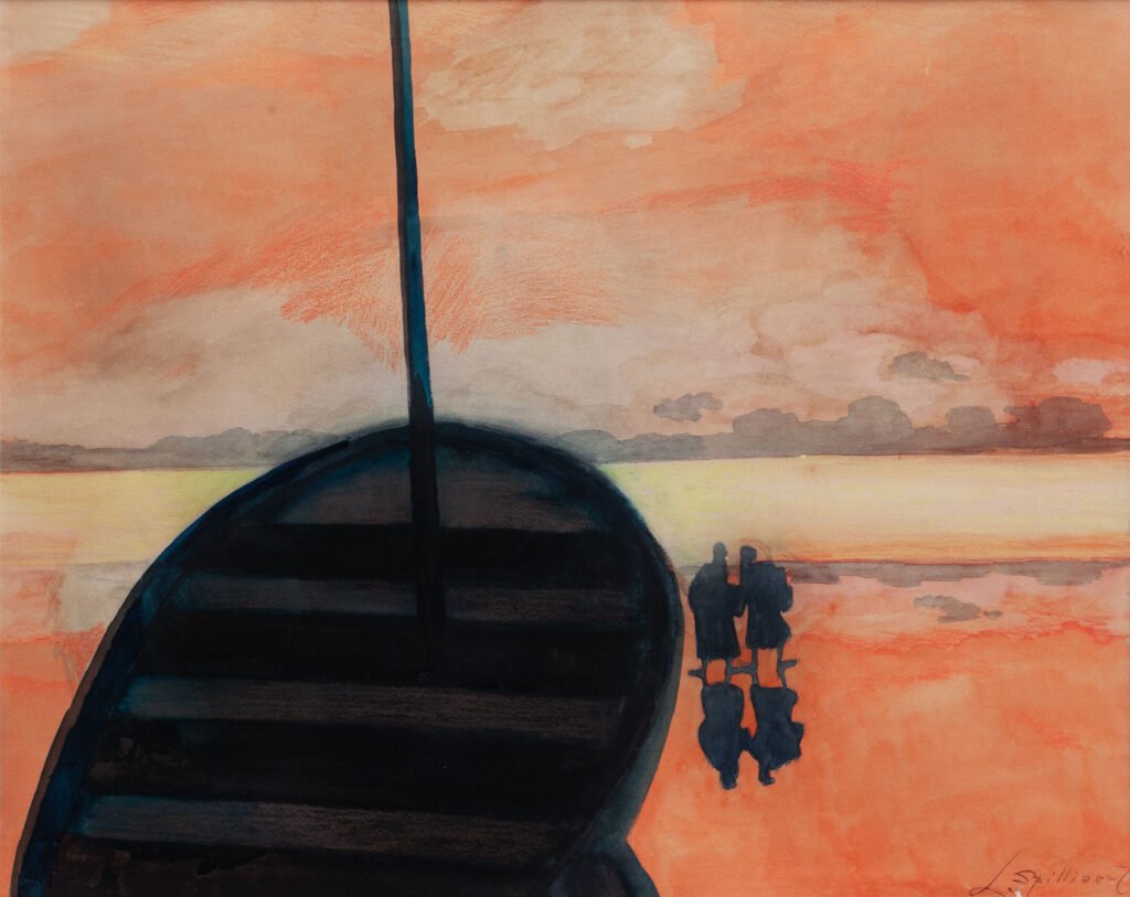 Barque noire sur fond de crépuscule rouge. La vocation de Pierre, 1918